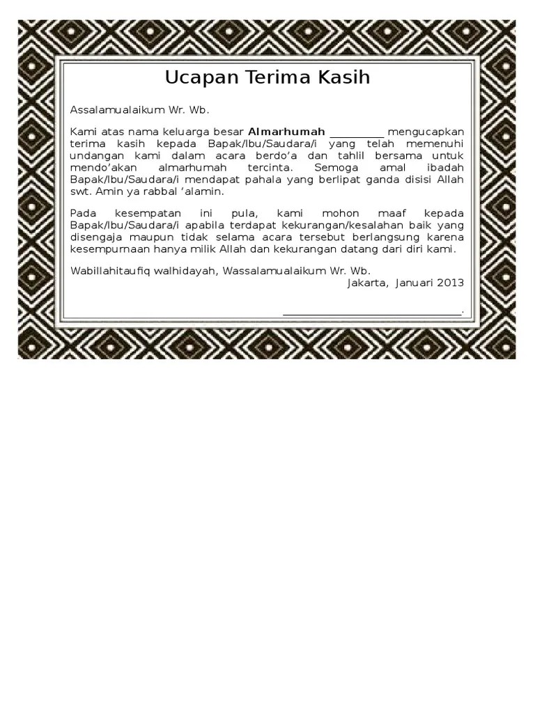 Tshumma ilaa jamii'i ahlil qubuuri minal muslimiina walmuslimaati walmu'miniina walmu'minaati mim masyaariqil ardhi ilaa maghooribihaa barrihaa . Kartu ucapan haul tahlil / 40 hari / 1000 hari stiker 15x9.4cm. Hasil gambar untuk contoh undangan tahlil yang bisa di edit. Tahlilan diadakan sebagai acara untuk memperingati hari kematian . Ucapan mengenang 40 hari orang meninggal bagikan contoh. Untuk pemesanan buku yasin & tahlil termurah bisa di order di percetakangoprint . Documents similar to ucapan terimakasih tahlilan.doc. 24 kata mutiara 40 hari kematian photos kata mutiara terbaru doa 40 hari . Kata pengantar yasin mbah uti. Sajadah murah berkualitas tahlilan oleh oleh 40 hari haul souvenir. Kami akan memberikan beberapa contoh kata sambutan tuan rumah acara tahlilan. Tahlil adalah salah satu tradisi yang paling mencolok dalam masyarakat muslim di indonesia. Tiada kata yang lebih baik yang dapat kami haturkan, kecuali ucapan.